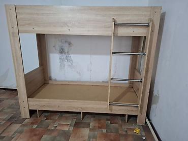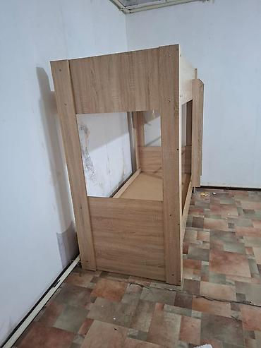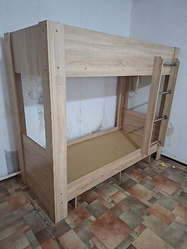 Двухъярусная кровать из ЛДСП в цвете «дуб» с вертикальной лестницей.