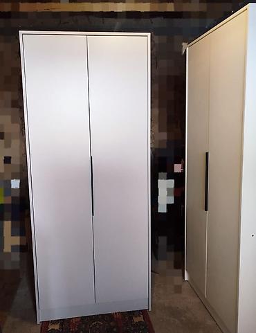 Двухдверные шкафы для хранения, современный минимализм. - Корпус и фасады: светлые тона (белый/светло‑серый), ровные гладкие двери без фрезеровки. - Ручки: длинные вертикальные, черные, визуально ...