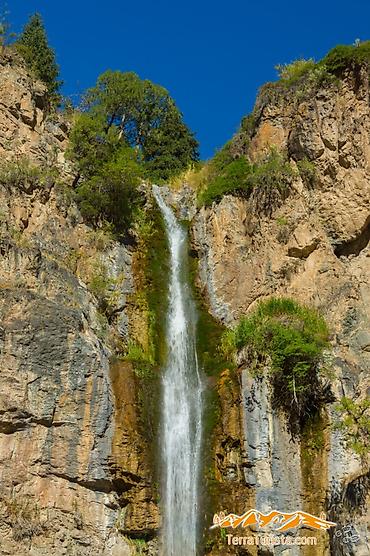 - Водопад в теснине: узкая каскада падает по мшистым скалам с высоты, удобные точки для фото; летом прохладный распыл, вокруг — карбонатные выходы и кустарники.