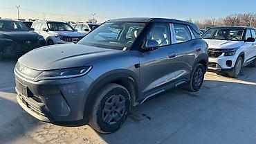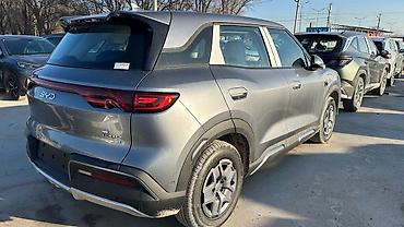 Компактный кроссовер на электротяге. Современный дизайн кузова с узкой светодиодной оптикой, сплошной задней LED‑полосой и интегрированным спойлером. Серый цвет, контрастные накладки на арках и порогах.