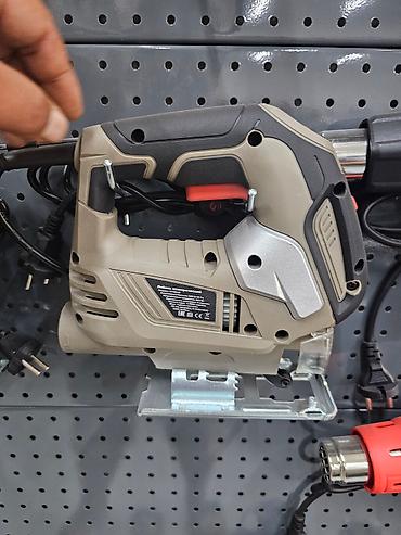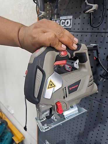 Электрический лобзик серого и черного цвета с красными акцентами