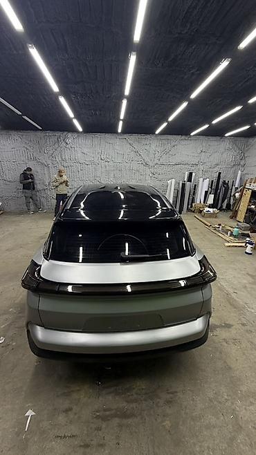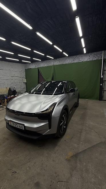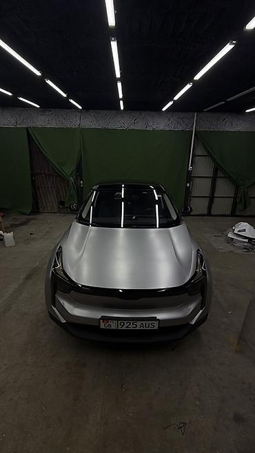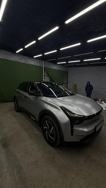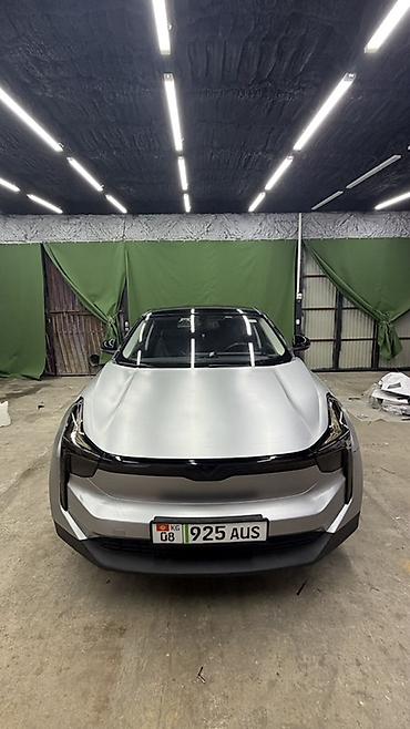 Электромобиль кроссовер (серебристый кузов, чёрная крыша, тонированные передняя и задняя оптика). Современный футуристичный дизайн с непрерывной светодиодной линией спереди и сзади, скрытые дверные ручки, аэродинамичный бампер. Пятидверный кузов, панорамная чёрная крыша, литые диски, шины низкого профиля. Зарядный порт расположен на левом переднем крыле.