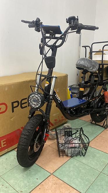 Электроскутер/электромопед с центральной съёмной батареей и расширенной грузовой оснасткой.