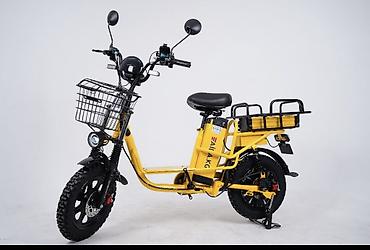 Электровелосипед/электроскутер грузовой форм‑фактора. Основные особенности: - Электромотор, привод на заднее колесо - Аккумуляторно‑батарейный блок по центру рамы - Усиленная задняя грузовая платф...