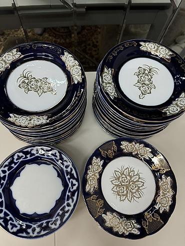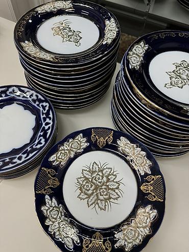 Фарфоровые столовые тарелки с глубоким кобальтовым фоном и золотистым декором.