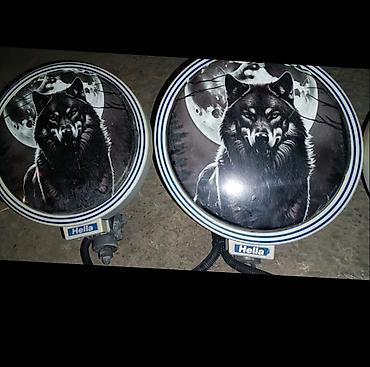 - Круглые корпуса с фирменными защитными колпаками HELLA; на колпаках рисунок «волк и луна».