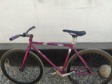 - Рама: стальная, классическая трековая геометрия, цвет фиолетовый/бордовый, украшена стикерами.