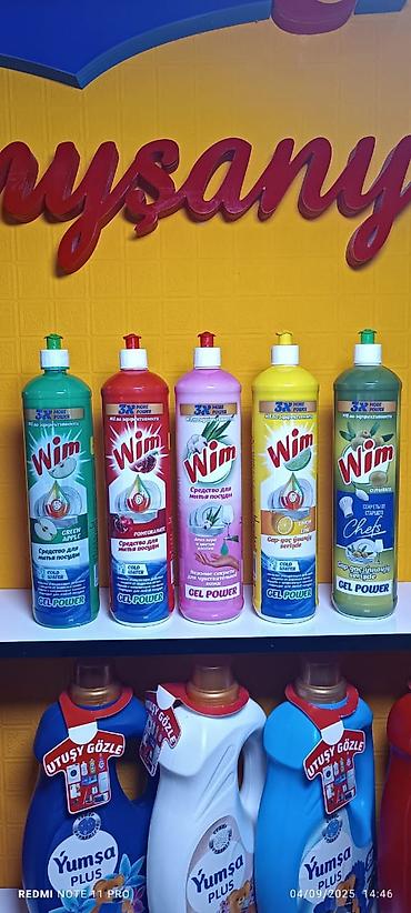 Дополнительно в ассортименте на фото: ополаскиватели и ароматизаторы для одежды Yumsa Plus, средства для мытья посуды Wim с разными ароматами.