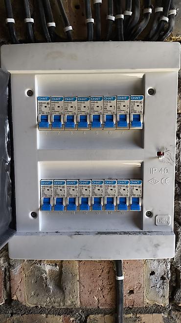 - Установка автоматических выключателей CHINT/аналогов (C10–C40), УЗО/дифавтоматов, реле контроля напряжения, счётчиков, индикации