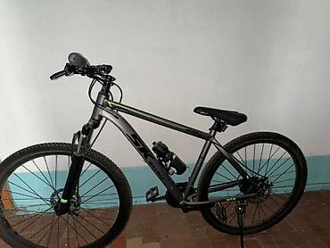 Подходит для езды по городу и пересечённой местности: надёжная дисковая тормозная система, 29-дюймовые колёса для лучшего накатa и проходимости, амортизационная вилка для комфорта на бездорожье. Цвет: серый с чёрными и салатовыми акцентами.