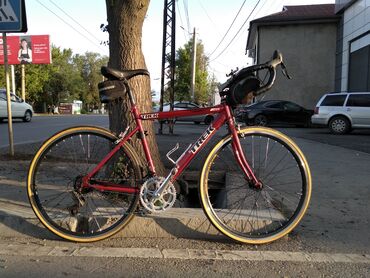 - Рама: алюминиевая, классическая геометрия, размер ближе к среднему (ориентируйтесь по фото). Цвет – бордовый металлик с фирменными логотипами Trek.