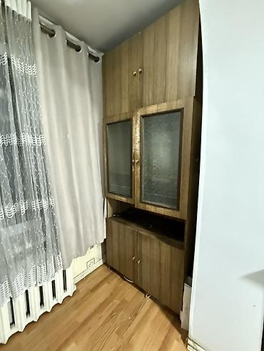 - Шкаф-витрина напольный, секционный. Верхний антресольный модуль с дверцами на ручках-пуговках, центральная часть с двумя витринными дверцами из стекла с рельефным рисунком, открытая ниша под ТВ/декор, нижний шкаф с глухими дверцами. Корпус под древесину тёплого оттенка. Компактная глубина — удобно для узких ниш и коридоров.