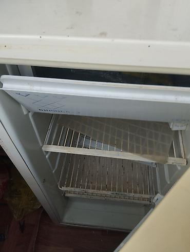 - Компоновка: одна дверь, верхняя морозилка с откидной крышкой «Бирюса», холодильное отделение с двумя проволочными полками и прозрачным пластиковым лотком.