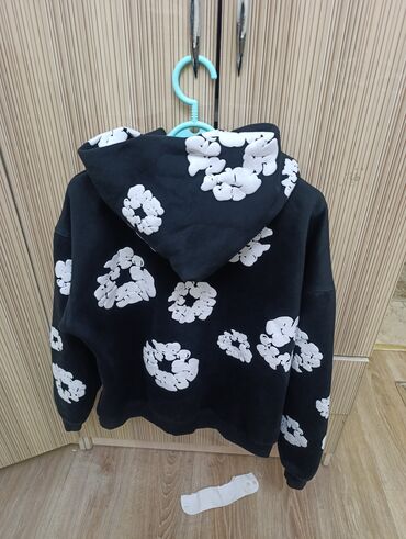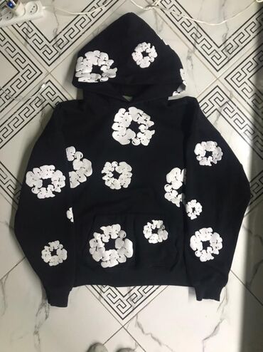 - Принт: крупные белые кольца/цветочные мотивы, расположены на передней и задней части, на рукавах и на капюшоне.