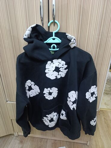 Худи с капюшоном, черное, с контрастными белыми принтами по всему изделию.