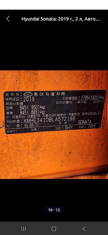 - Заводская шильда с корейской маркировкой: модель SONATA, год 2019, данные о массе и комплектации указаны на фото.