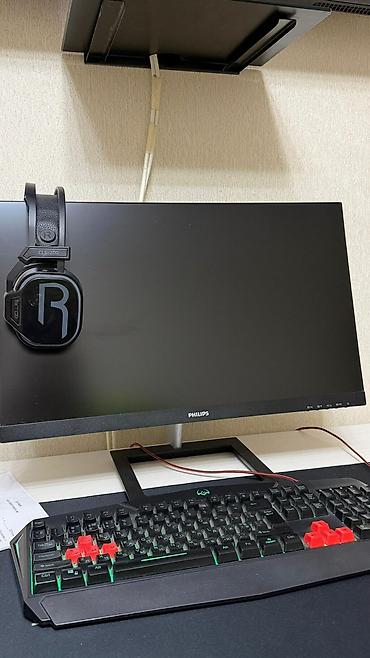 - Монитор Philips, диагональ 24–27" (широкоформатный, узкие рамки). На нижней грани – кнопки управления и индикаторы, устойчивое подставочное основание с кабель-каналом.