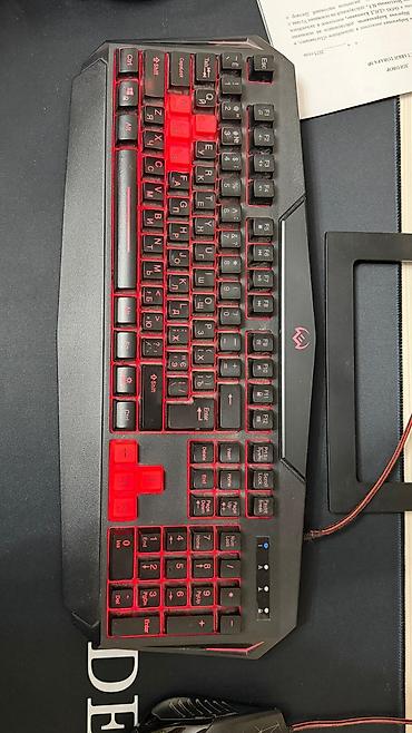 - Проводная игровая клавиатура с русско-английской раскладкой, подсветкой и выделенными красными клавишами (WASD, стрелки), увеличенная подладонная опора.