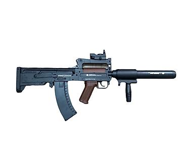 - Дизайн: стилизация под тактический автомат с складным прикладом, верхней планкой под прицел, пистолетной рукоятью и удлинённым дульным модулем.