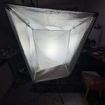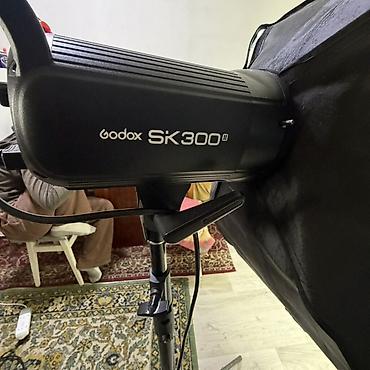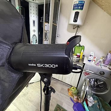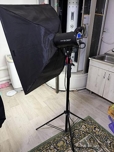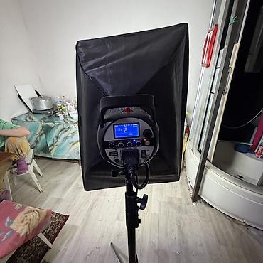 - В комплекте на фото: моноблок SK300II, прямоугольный софтбокс с внутренним/внешним диффузором, студийная стойка, сетевой кабель