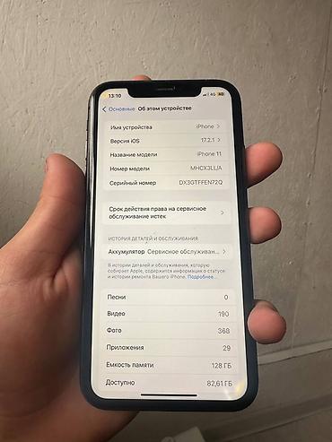 - На фото в «Об этом устройстве» видно: модель iPhone 11 (MHCX3LL/A), серийный номер частично показан.