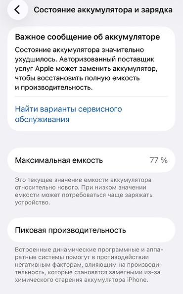 - В разделе “Состояние аккумулятора” отображается «Максимальная ёмкость: 77%» и сообщение о необходимости замены для восстановления полной ёмкости и производительности.