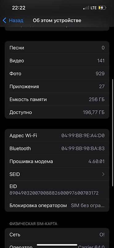 - Память: 256 ГБ (доступно ~196,77 ГБ на момент скриншота)
