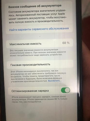 - На экране отображается сообщение о необходимости обслуживания аккумулятора; максимальная емкость 68%, включена оптимизированная зарядка.