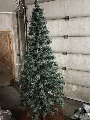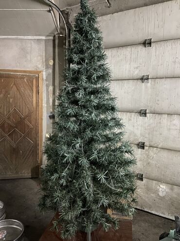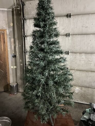 Искусственная новогодняя ель, пушистая, классической конусовидной формы. Высота ориентировочно 1,8–2 м (см. пропорции на фото). Хвоя темно‑зеленая с легким «зимним» налетом, ветви густые, разной длины, создают естественный силуэт. Материал веток — ПВХ/леска, безопасный для дома, не осыпается. Каркас металлический, устойчивая складная подставка-штатив входит в комплект.