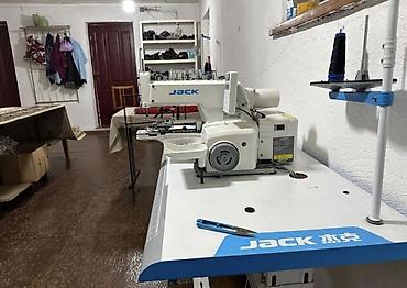 Промышленная петельная и пуговичная машина JACK (распошив/coverstitch) на столе со штативом для нитей и педалью.