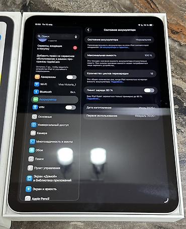 - На экране в настройках — iPadOS с пунктом «Аккумулятор», Wi‑Fi и Bluetooth активны