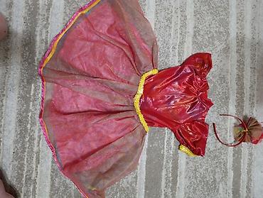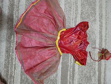 Примерный возраст/рост: ориентируйтесь по фото — модель рассчитана на дошкольниц (юбка пышная, длина около колена). Материалы: синтетические с блестящим эффектом (атлас/стрейч + сетка/органза). Цвета: красный, розовый, золото.