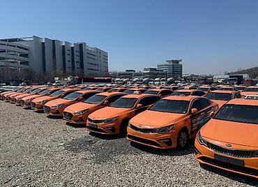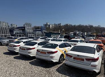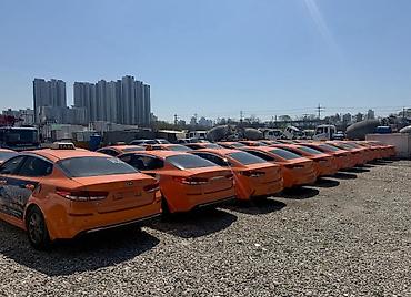- Большой выбор седанов Kia одного класса, окраска оранжевая и белая с таксометрами/шашками на крыше.