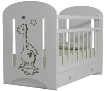 Классическая прямоугольная детская кровать для новорожденного DINO с маятником, ящиком и забавными аппликациями. Изготовлена из натурального массива березы.