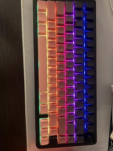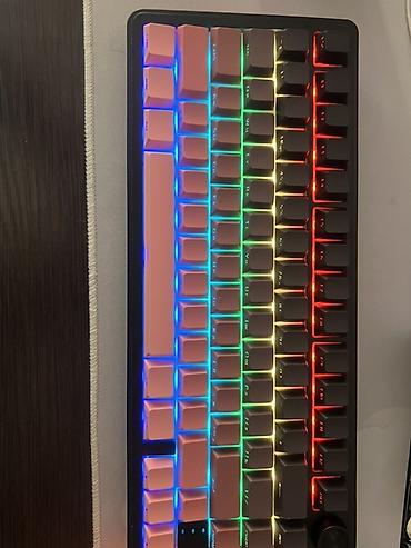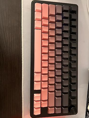 - Двухцветные кейкапы в градиенте от розового к тёмно‑серому, с полупрозрачной легендой для яркой подсветки.