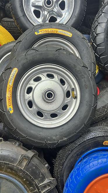 Пневматическое колесо в сборе (шина + металлический диск с подшипником) - Размер шины: 4.00-8 (надпись на боковине) - Производитель: HUANG JIN CHUAN SHAN JIA (маркировка на шине) - Камерная шина с...