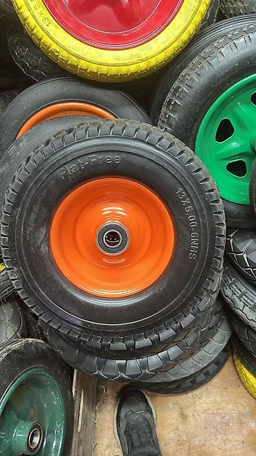 - Разные типоразмеры и протекторы: на фото видны варианты 13x5.00-6 (Flat-Free — пенополиуретан, не прокалывается), пневматические 3.25-8 и др.