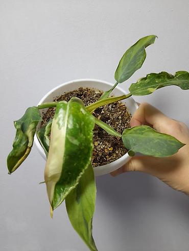 - Молодое ароидное с мраморной/пёстрой зеленью на листьях (компактный саженец в квадратном горшке). Хорошо растёт при ярком рассеянном освещении, укореняется в лёгком субстрате, отзывчив на опору по мере роста.