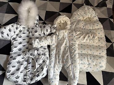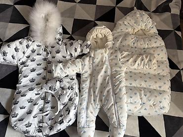 3 шт за 600 сом. Комплекты для малыша(за все 600сом, бонусом отдам вещи для мальчика и девочки до года): 1) Зимний комбинезон-слип с капюшоном, с нашивками (жираф, домик и др.). Внешний слой — неп...