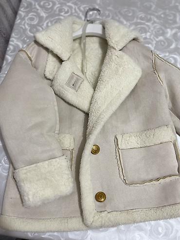 - Полушубок/куртка на пуговицах: молочно‑бежевый цвет, плотная меховая подкладка по всему изделию, широкий отложной воротник, манжеты и низ с меховой отделкой, два вместительных накладных кармана, золотистые пуговицы спереди.