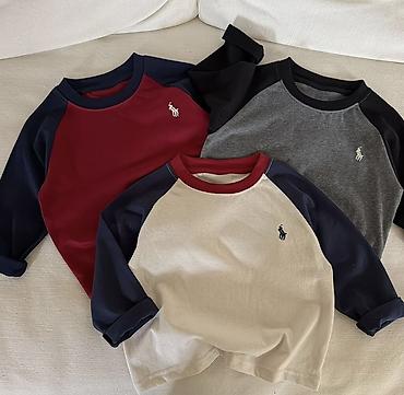 - Лонгсливы реглан: контрастные рукава и ворот, небольшая вышивка на груди. Три расцветки — бордовый/тёмно‑синий, серый/чёрный, молочный/бордовый/тёмно‑синий. Мягкий хлопковый трикотаж, свободная посадка, рукава можно подворачивать.