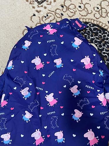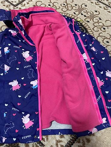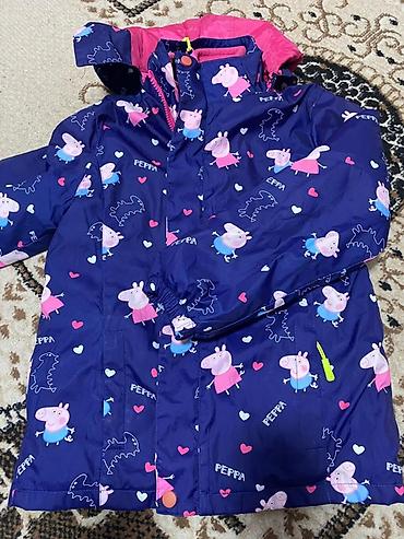 - Верх: тёмно-синяя водо- и ветронепроницаемая ткань с принтом Peppa Pig, капюшон, молния по всей длине, планка на кнопках, боковые карманы.