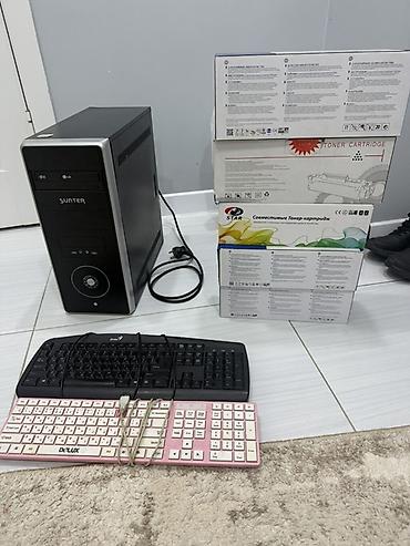 Комплект для офиса/дома: системный блок + 2 проводные клавиатуры + набор лазерных картриджей. 1 Картридж новый, не распакован. Системный блок запускается, работоспособность не гарантирована. Остальные картриджи тоже работоспособность не гарантированы. Не известно пустые или заправленные. Без вопросов без торга Две тысячи сом.