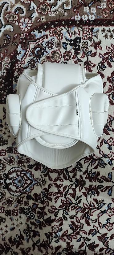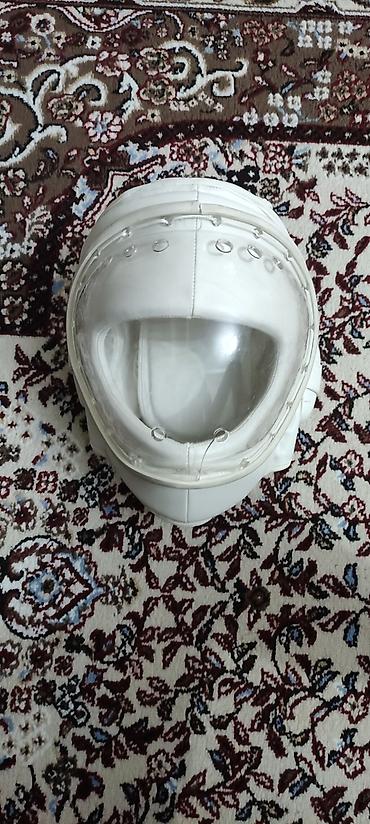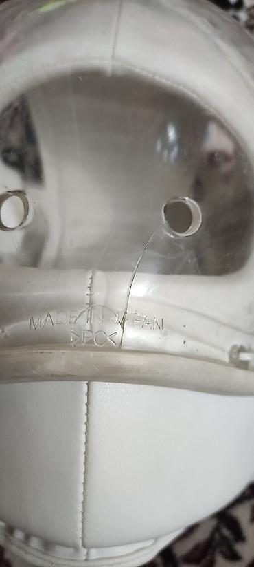 - Шлем белый с прозрачным лицевым экраном (поликарбонат, маркировка Made in Japan). Полный охват головы, защита ушей и подбородка, широкая липучка сзади для фиксации.