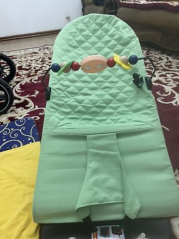 - Шезлонг для малыша: мягкое сиденье светло‑зелёного цвета с простёганной спинкой, ремни фиксации, съёмная дуга‑игрушка с разноцветными бусинами и фигурками. Подходит для отдыха и игры, компактный, легко переносится.