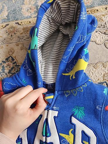 Комплект тёплых детских комбинезонов 1) Комбинезон с капюшоном GAP: - Голубой фон с ярким динозавровым принтом - Большая вышивка/аппликация GAP спереди - Молния по центру до низа штанины для удобн...