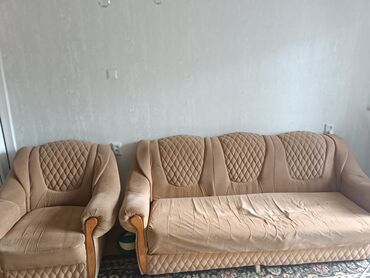 - Обивка: велюр/флок бежевого (песочного) цвета с простежкой «ромбы» на спинках и цоколях.