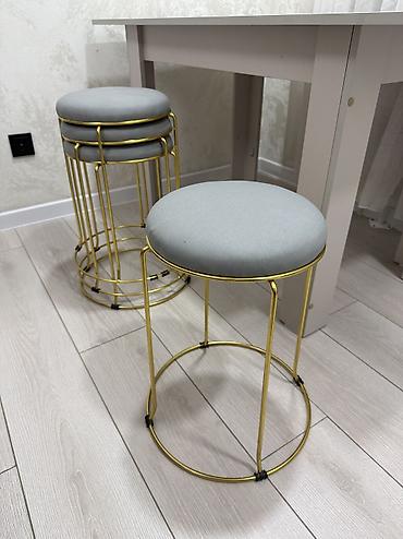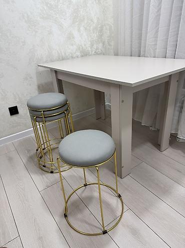 - Современное сочетание светлого стола и табуретов с золотистым металлом