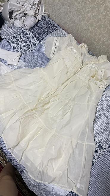 - Кремовое легкое платье с оборками и кружевными вставками по лифу, расклешенная многослойная юбка-миди.