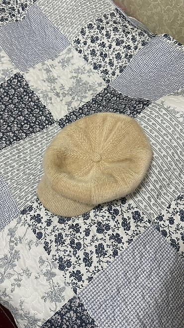 - Молочно-бежевая вязаная кепи-берет с мягким козырьком.